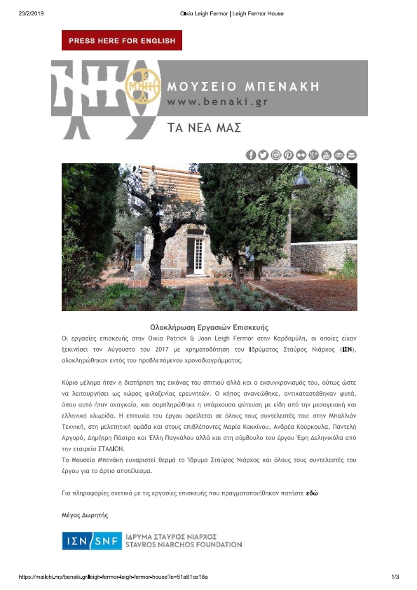 Μετά απο 1,5 χρόνο εργασιών αποκατάστασης, η οικία του Patrick & Joan Leigh Fermor θα είναι ξανά διαθέσιμη για το κοινό απο τοκαλοκαίρι του 2019.